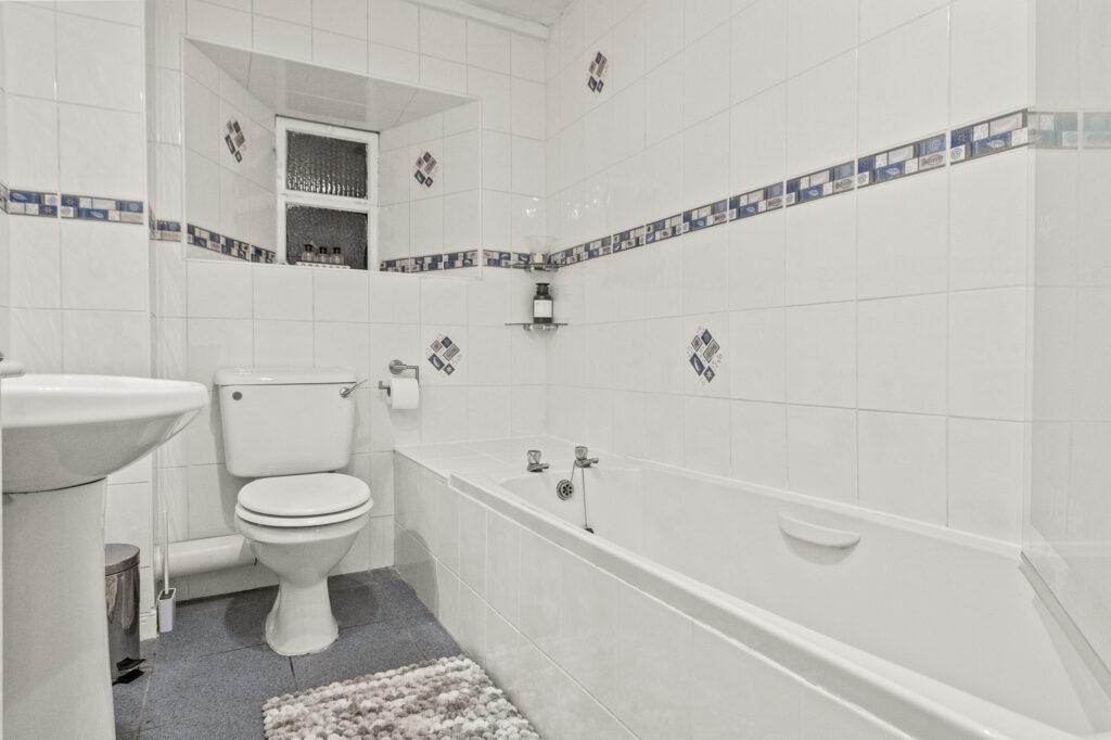 Fully tiled with a front-facing window and shelved storage cupboard. The suite includes a wash basin, WC, and bath with overhead shower and glazed screen.