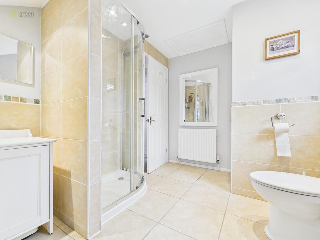SHOWER ROOM A matching suite with a fully enclosed corner shower cubicle, wash hand basin, low level WC, wash hand basin, radiator, heated towel rail and side facing window.