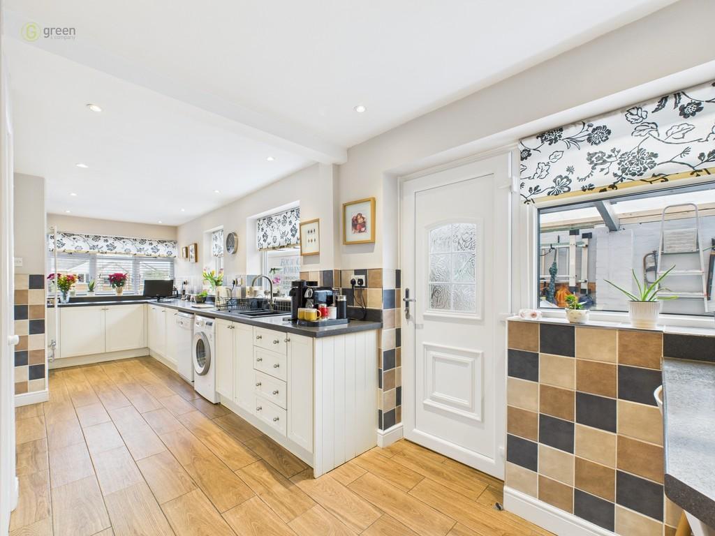 FITTED KITCHEN 8' 7" x 23' 7" (2.62m x 7.19m) To include a stylish and matching range of wall and base mounted units with complementing work surfaces over with tiled splash backs and under cupboard lighting, built in oven and hob with extractor fan over, space for a washing machine and dishwasher, space for an American style fridge freezer, sink and drainer unit, tiled flooring, a front facing window and two side facing windows, spot lights overhead, full height radiator a door to the garage and a door to the inner hallway.