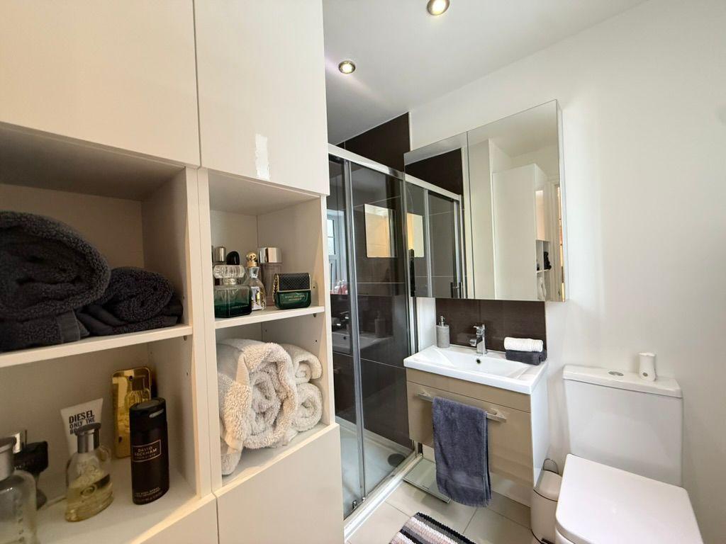 Featuring a walk-in shower with sliding glass door, wall-mounted vanity wash hand basin with illuminated mirror above, close coupled WC, chrome heated towel rail, porcelain tiled flooring and ceiling downlighters. UPVC frosted window to the rear elevation.