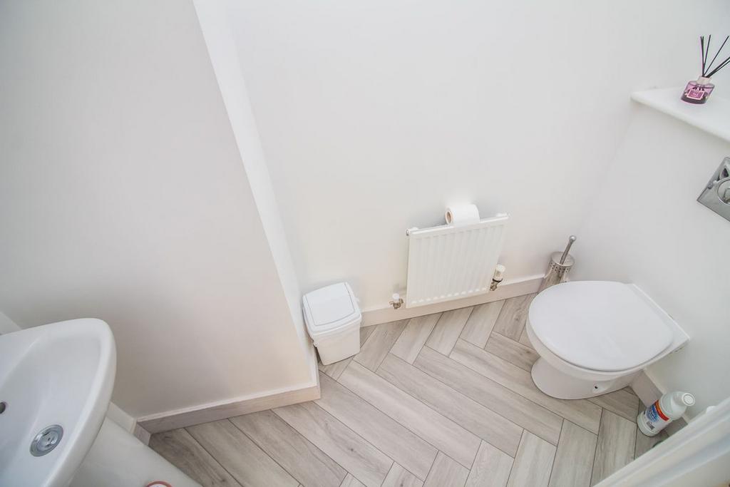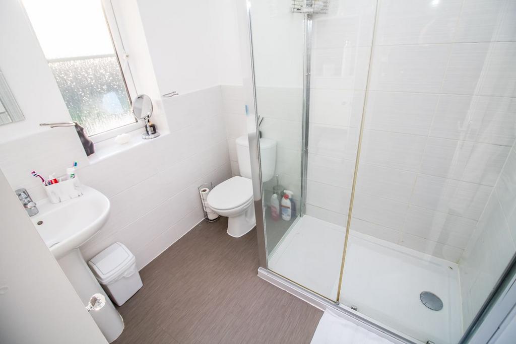 A larger-than-average en-suite comprising a white low-level WC, wash hand basin and walk-in shower with glass surround. The room is part tiled and benefits from a uPVC privacy window.