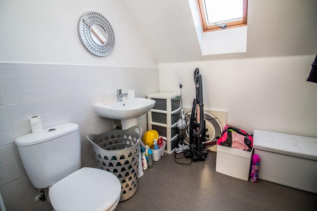 Comprising a white low-level WC, wash hand basin and shower with glass surround. The room is tiled and benefits from a uPVC Velux window.