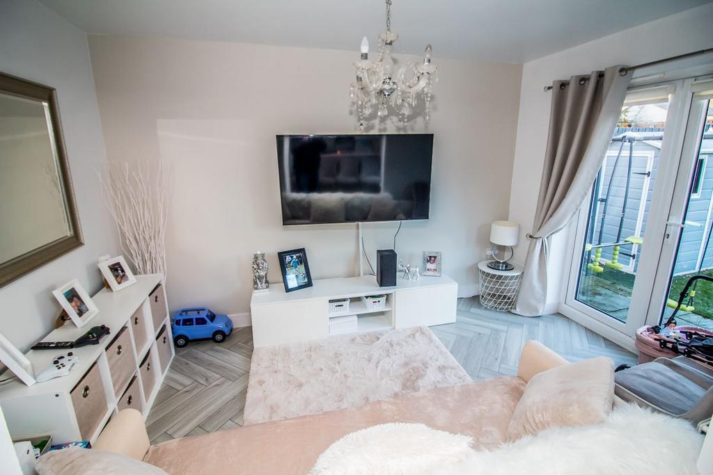 A beautifully presented and spacious reception room featuring carpeted flooring, a large uPVC window and a stylish built-in media wall.