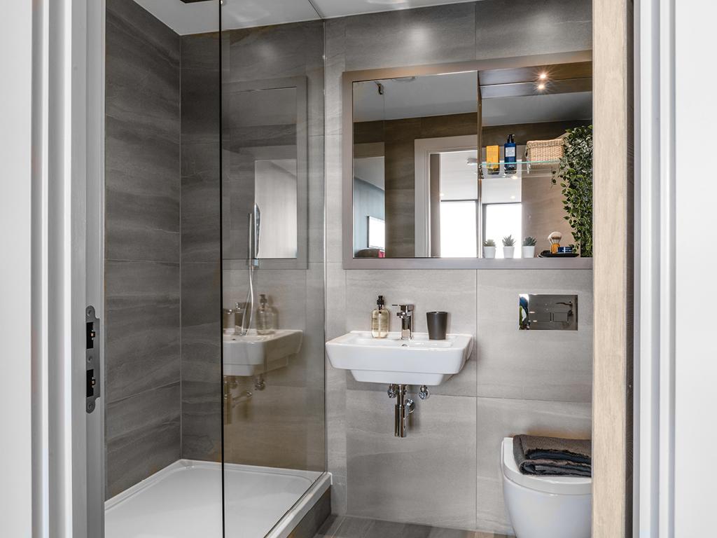 En-suite bathrooms with contemporary porcelain tiling throughout. Deluxe sized rainfall shower with separate handheld shower, WC and heated towel rail, plus bespoke vanity cabinet with LED lighting.
