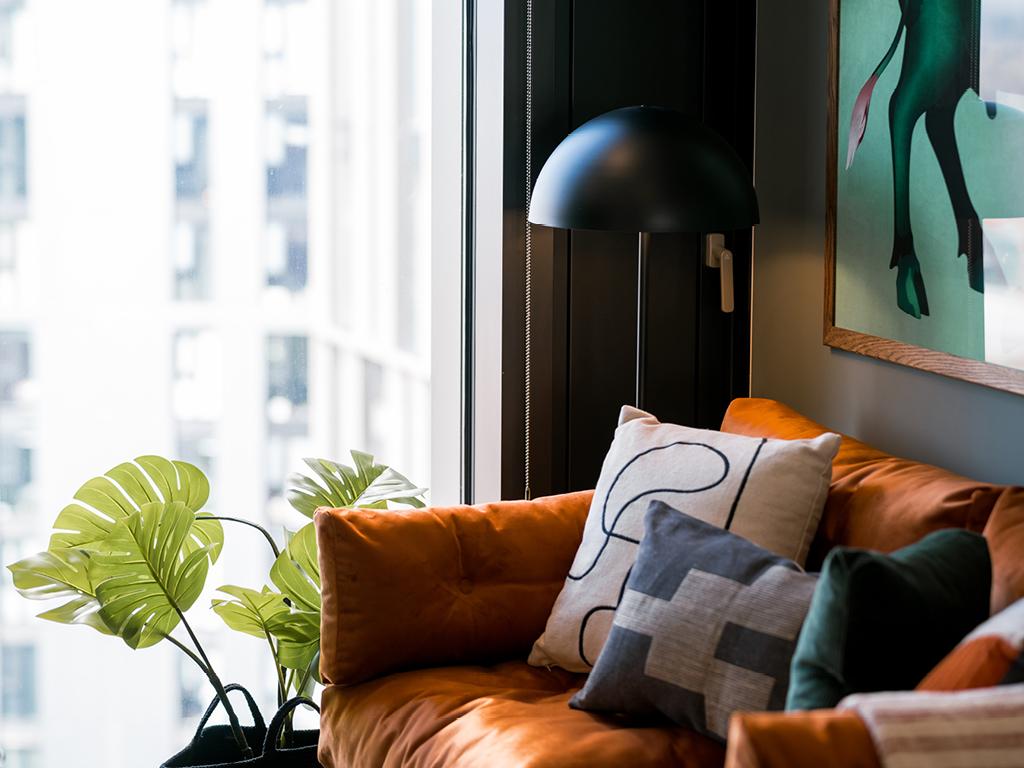 Light and spacious with floor to ceiling windows and blinds. Plush three-seater sofa, media storage unit with 50 inch Samsung 4K smart TV and nested coffee tables with mirrored tops.