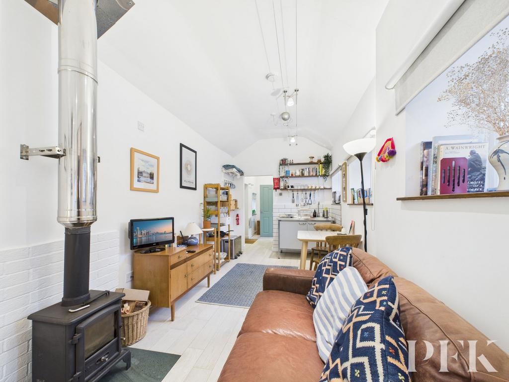 Windows to front aspect, window to side, feature fireplace with wood burning stove with stone hearth. Kitchenette with stainless steel sink and mixer tap, two ring hob and fitted shelving. Door and window to rear aspect and a fitted storage cupboard.