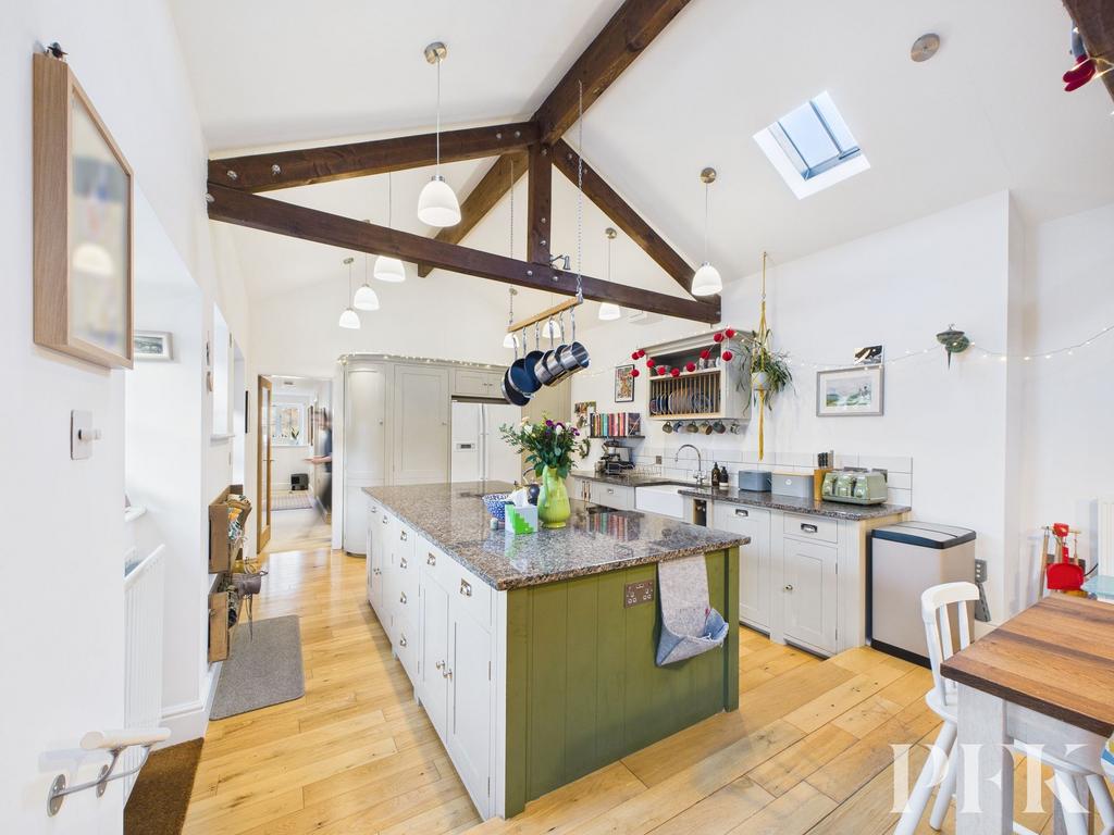 Vaulted ceiling, windows to side aspect and velux windows, oak flooring, a range of matching wall and base units, tiled splashback, complementary work surfacing, integrated dishwasher, space for a fridge freezer, Aga range oven with induction hob, ceramic deep set sink with stainless steel mixer tap and a radiator.
