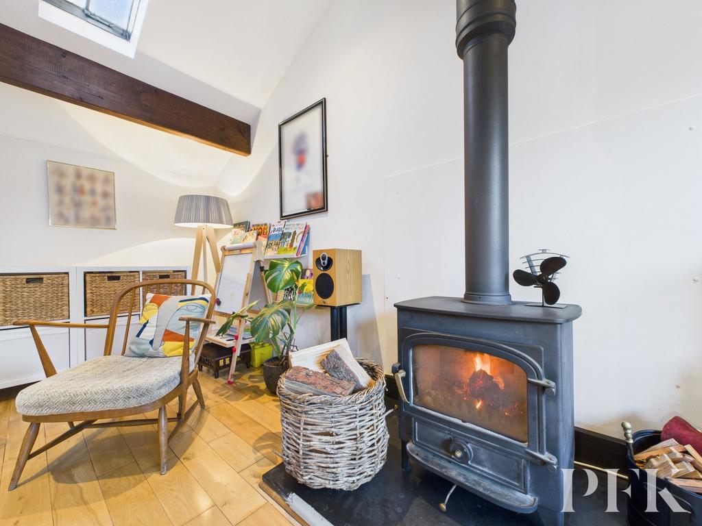 Vaulted ceiling, exposed beams, velux windows, patio doors into the courtyard garden, feature fireplace with wood burning stove on a stone hearth.