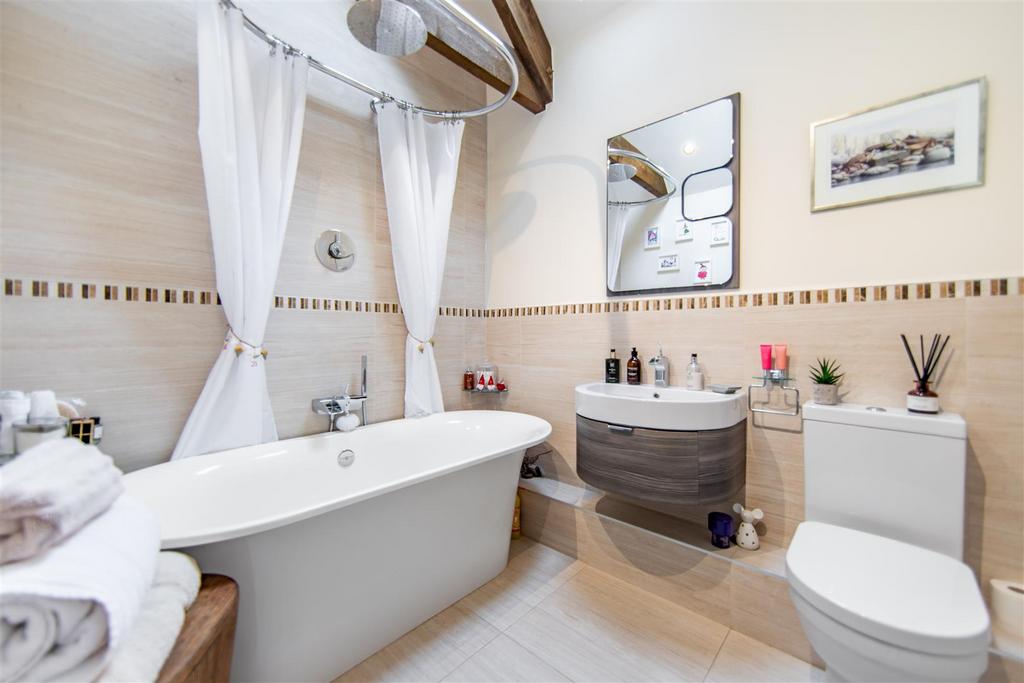 The hallway then leads through and into three double bedrooms, again all with vaulted ceilings and exposed roof trusses. The principal suite is positioned to the very end of the hall and away from the living area offering a quiet sanctuary with access to an en-suite shower room with three piece suite. Bedroom two is also a good sized double bedroom once again with vaulted ceiling and exposed beams. Bedroom three is a smaller double once again with original beams. The family bathroom is presented to a high standard and is fully tiled with three piece suite including a free standing bathtub.