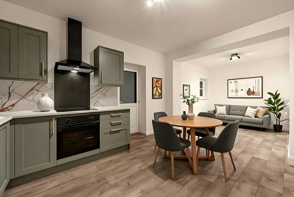 The main living space is arranged as an open plan kitchen, dining and sitting area, offering excellent flexibility for everyday living. The kitchen is fitted with modern units in a muted green tone, complemented by marble-style splashbacks and work surfaces. Integrated appliances include an oven, hob with extractor, and washing machine, with space provided for a freestanding fridge freezer. The kitchen opens naturally into the living area, which benefits from ample floor space, neutral décor and wood effect flooring, making it easy to furnish for both dining and relaxation.