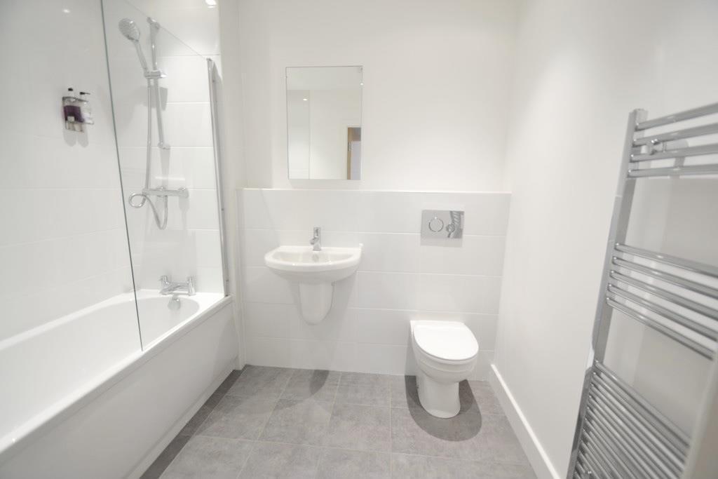 The bedroom is generously sized, offering a peaceful retreat after a long day. The luxurious white bathroom is a highlight, featuring both a shower and a bath for your convenience and relaxation.