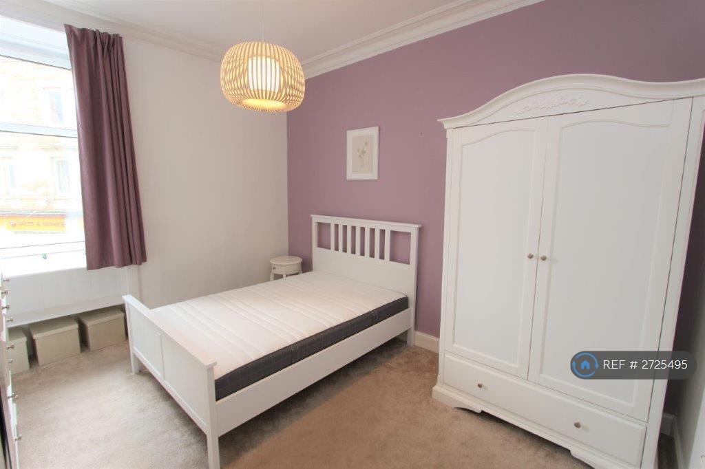 This is a bright first floor one bedroom flat with an open plan kitchen/living area. The kitchen area has fridge/freezer, oven and hob. There is a washer/dryer in a large cupboard off the living area which also provides additional storage. There is a spacious bedroom and shower room off the hallway. All rooms have double glazed windows and the flat has gas central heating. Access is available to a shared garden at the rear of the tenement.