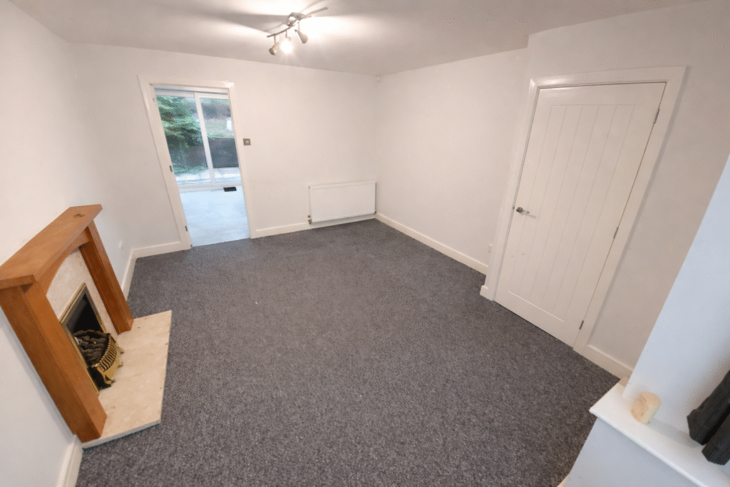LIVING ROOM - As you enter the property through the entrance hall, to the left is the spacious living room with soft grey carpet and white walls. There is ample space for furniture of your choice such as a sofa and TV, allowing you to make it your own, and a decorative fireplace brings character. A large front-facing window fills the room with natural light.
