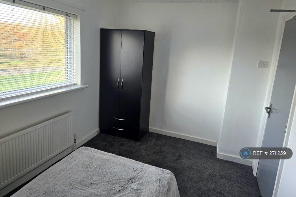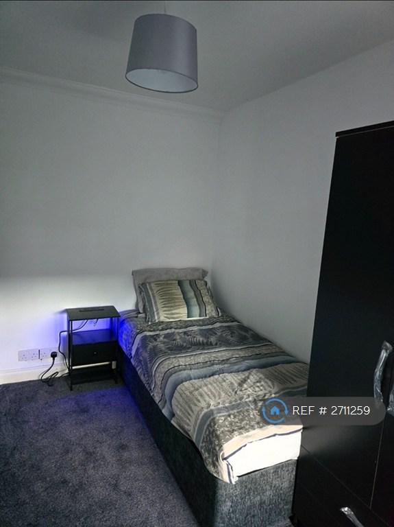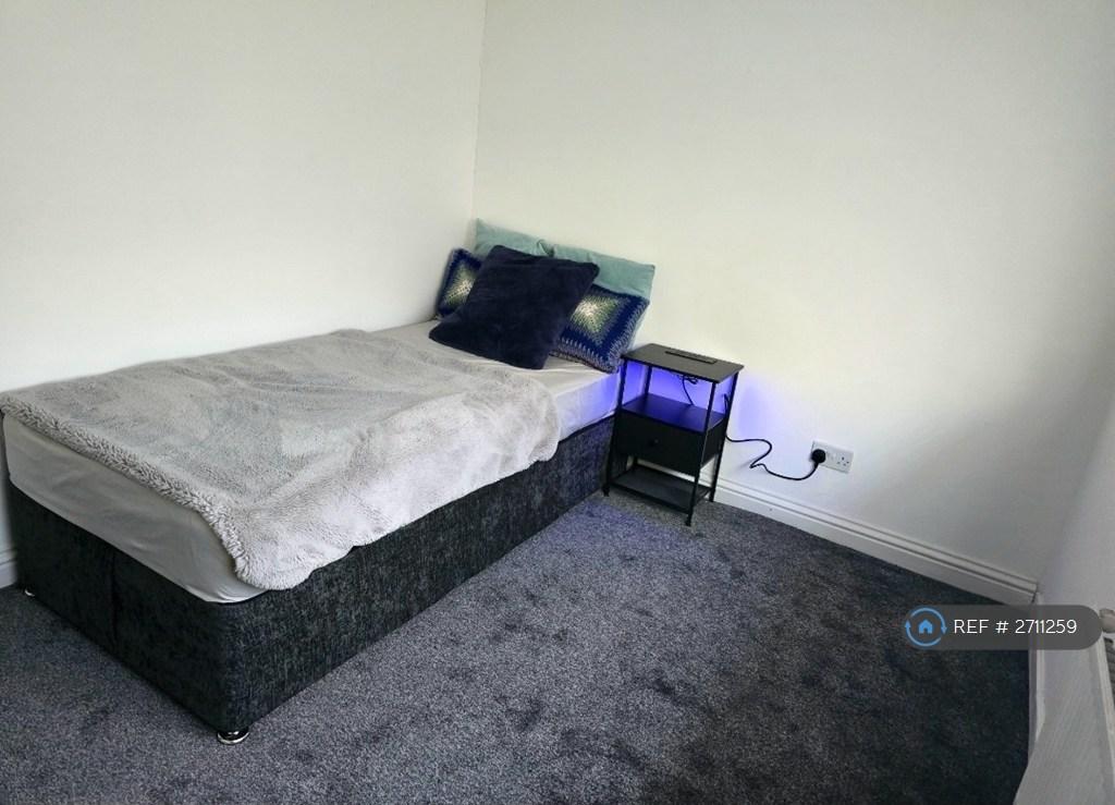 Single bedroom with single bed, bed side media unit with built in double sockets and double usb C power supply, mattress and wardrobe. £475pcm.