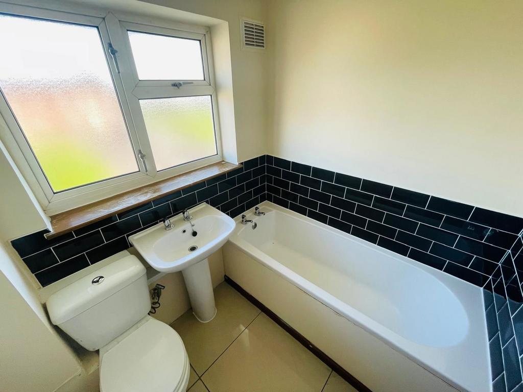 Single-glazed front window, panelled bath, pedestal wash basin, low-flush WC, tiled walls, central heating radiator, and door to landing.