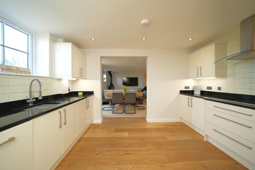 A superbly spacious and bright reception room, the lounge diner features double-glazed French doors opening out to the rear patio and offering glorious countryside views. A further double-glazed window overlooks the rear garden, enhancing the natural light throughout. The room benefits from underfloor heating, spotlights to the ceiling and a stunning feature log burner, creating a wonderfully cosy focal point. An open walkway leads through to the entertainment kitchen diner, with additional oak glazed French doors returning to the entrance hall.
