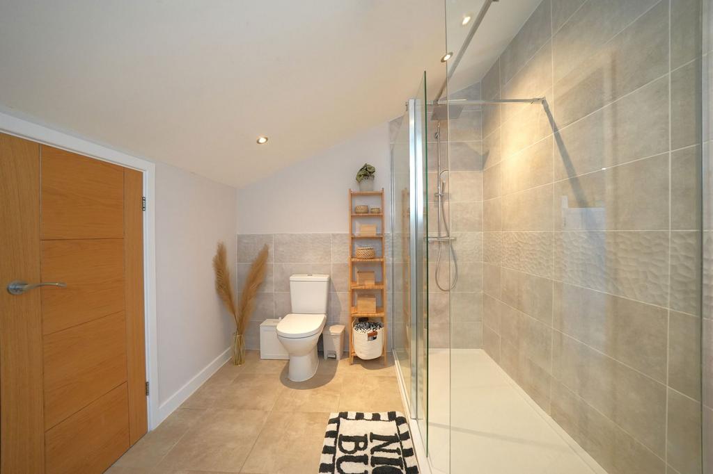 The en-suite is finished to a high standard and includes a walk-in shower area, low-flush WC, wall-mounted wash basin, tiled flooring and part tiled walls. Additional features include a shaving point, LED mirror and extractor fan, creating a sleek and contemporary finish.