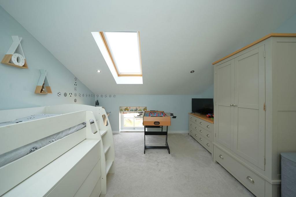 Featuring rear-facing double-glazed windows and a skylight with countryside views, this bedroom includes a central heated radiator, door to the landing, and TV and aerial points.