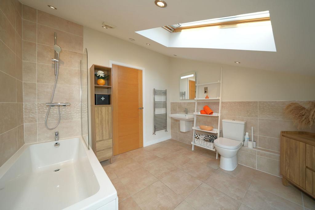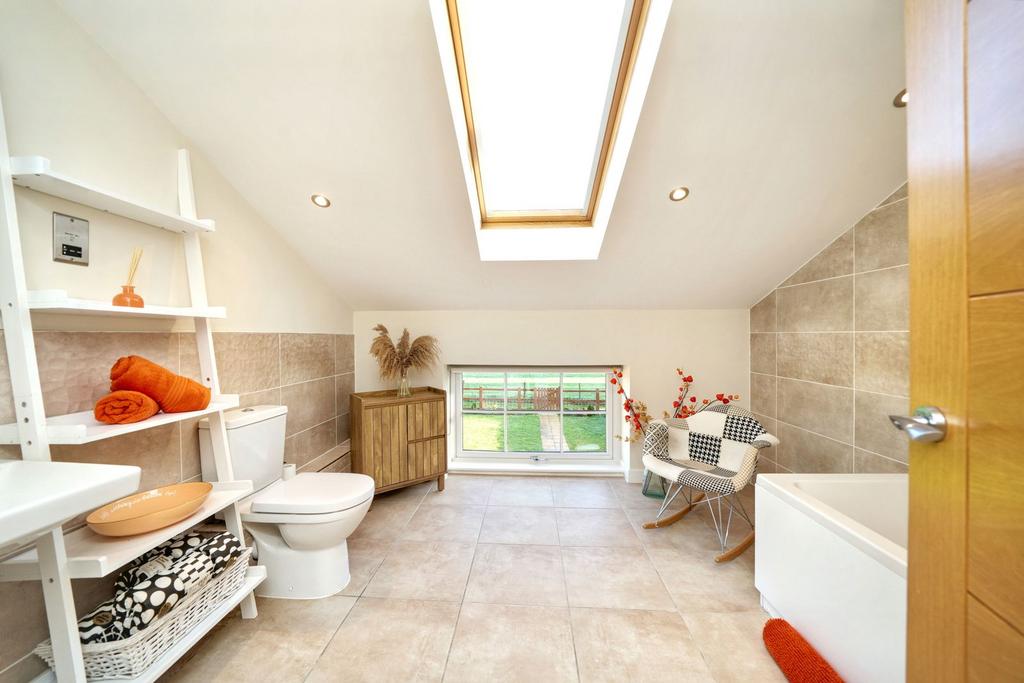 The family bathroom includes a rear-facing double-glazed window and skylight with countryside views, a tiled floor and partially tiled walls, LED mirror, shaving point, extractor fan, and ceiling spotlights. The fitted suite comprises a panelled bath, low-flush toilet, and wall-mounted wash basin.