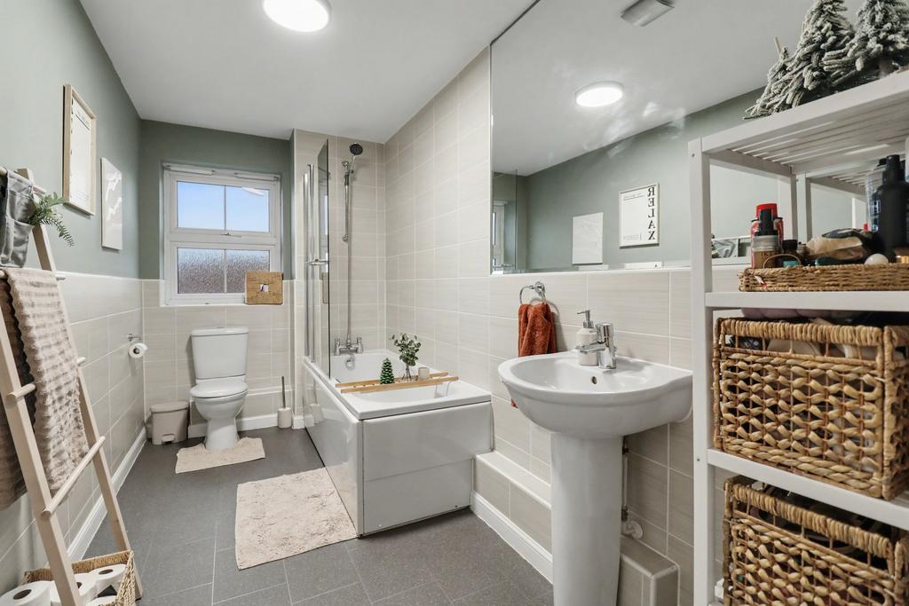 The good size modern family bathroom has a window to the front, a panel enclosed bath with shower over, wash hand basin and a WC.