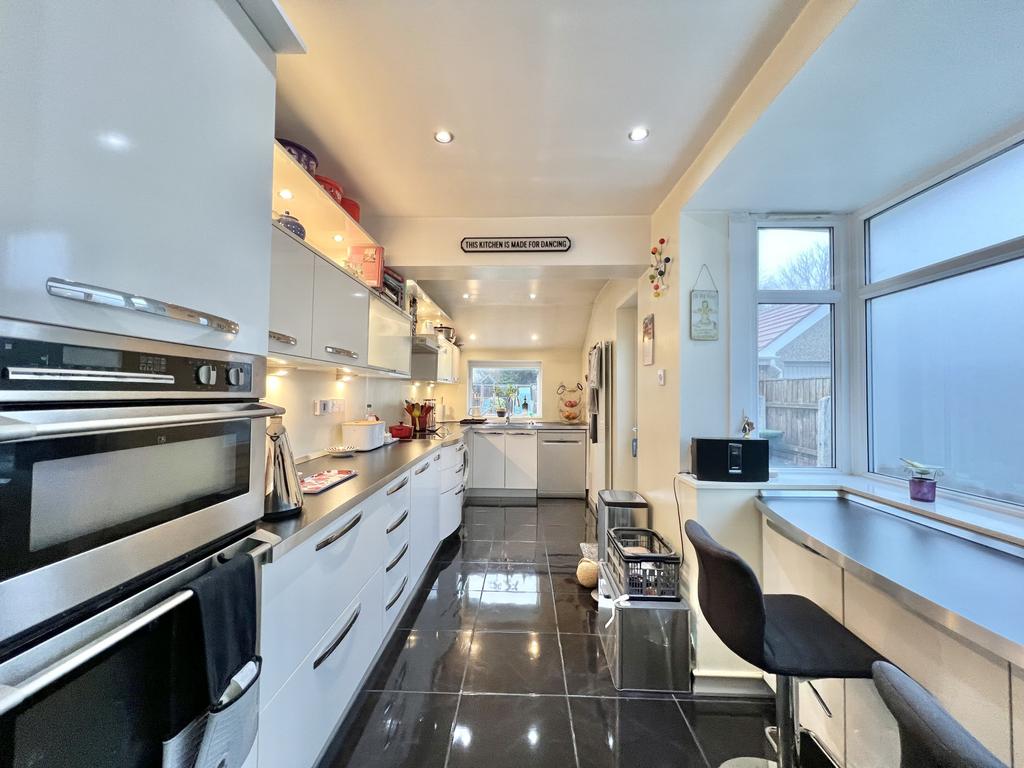 UPVC double glazed window to the rear aspect, door and box bay window to the side aspect. Modern fitted kitchen with a range of base units with complementary work surfaces, sink with drainer with mixer tap, integrated oven and grill, space for fridge/freezer, plumbing for a washing machine and dishwasher, wall mounted radiator and breakfast bar with storage under.