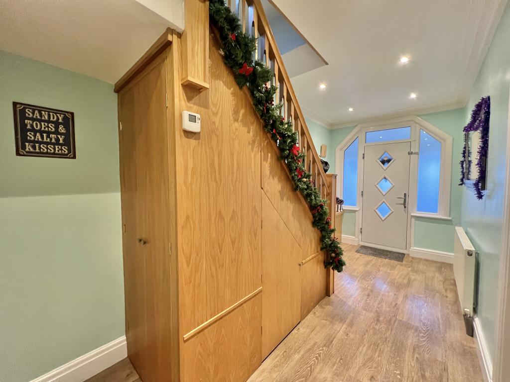 Composite front door and windows, meter cupboard, radiator stairs leading to first floor with storage under.