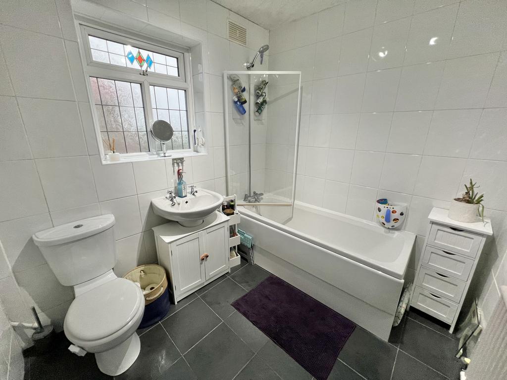 UPVC double glazed stained glass window to the side aspect. Fitted three piece suite briefly comprising: panelled bath with overhead shower, wash hand basin, low flush wc and radiator.