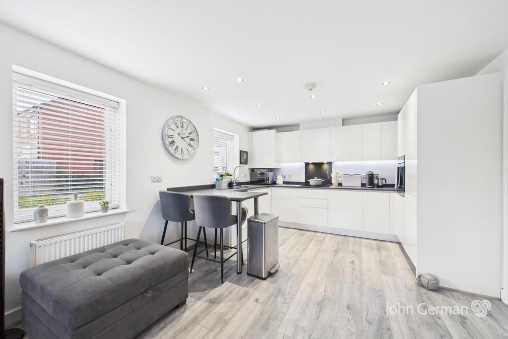 The kitchen/dining/living space is light and airy with a dual aspect. The kitchen area is superbly appointed with fitted units and a breakfast bar, integrated oven, hob and fridge/freezer, and space for lounge and dining furniture, with windows to side and rear.