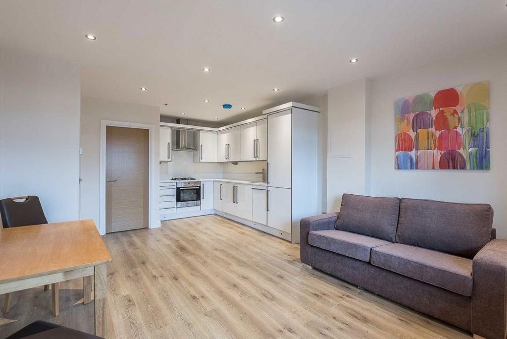 A mid floor modern flat to rent with wooden floors, comprising a modern open plan kitchen/reception room, bathroom and two double bedrooms.