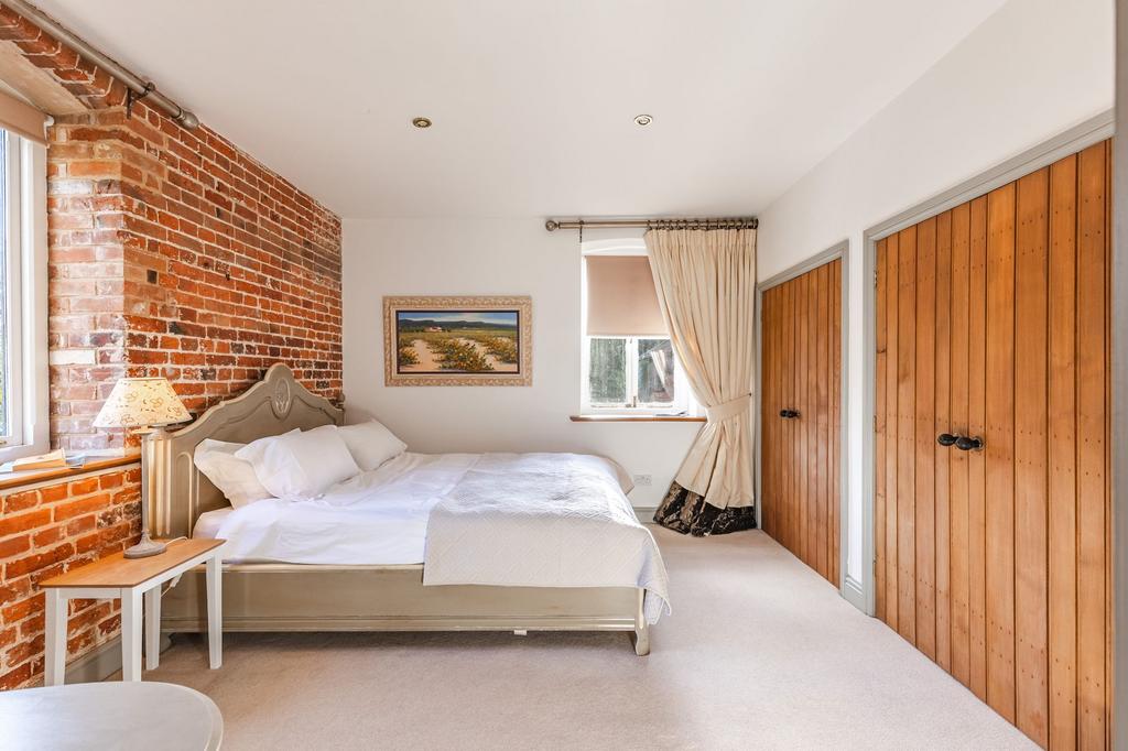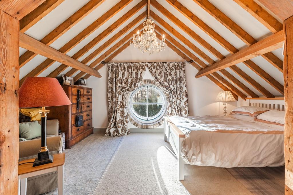 A staircase rises from the entrance hall to the generous principal suite on the first floor. Occupying the southern end of the building it includes a substantial double bedroom, large en-suite bathroom and an impressive dressing room with floor-to-ceiling fitted wardrobes. The remainder of the first floor opens into the barn’s truly breathtaking formal reception space. Double-height with exposed beams, brickwork, elegant plaster detailing and an imposing central fireplace, it is an extraordinary room in both scale and atmosphere. A double staircase leads to a large double bedroom with sumptuous en-suite while at the other end a cast-iron spiral staircase accesses a further mezzanine room via a gantry.