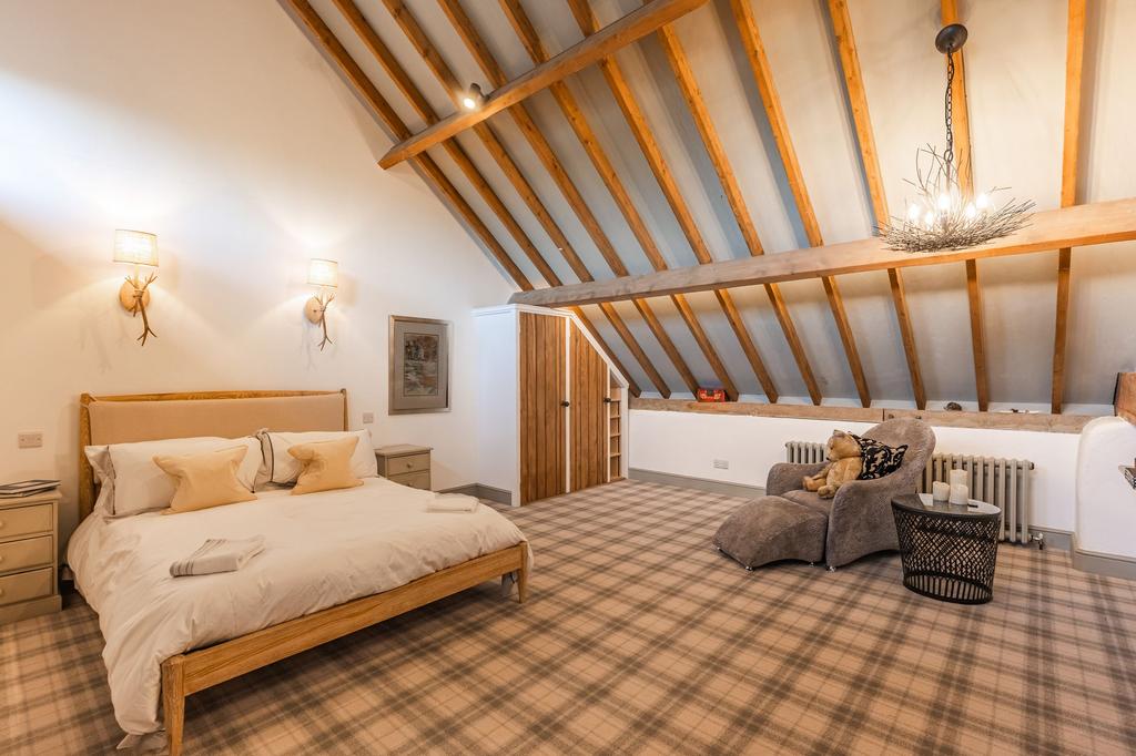 Converted around 30 years ago and meticulously updated by the current owner, the barn is presented in immaculate, refined condition throughout. Entry is via the spectacular full-height glazed cart entrance or, more informally, through the rear boot room linking the gardens and garage. The ground floor flows beautifully, centred around a Kitchens Etc. farmhouse kitchen with dining area, walk-in pantry, and adjoining entrance lobby that doubles as a relaxed living space. Practicalities are well covered with a laundry, utility room, boot room and guest WC. Two ground-floor double bedrooms, one with an en-suite, the other served by a separate shower room, offer flexibility for guests or single-level living.