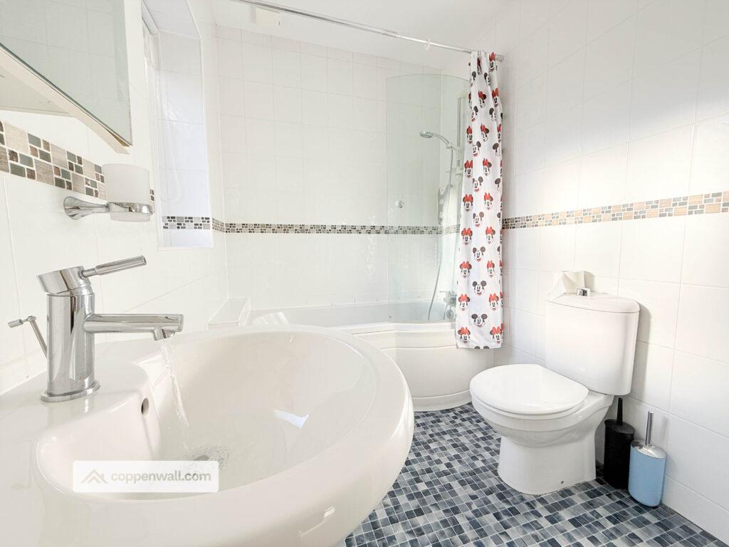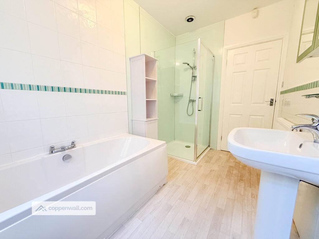 A spacious family bathroom featuring a fitted bath, separate shower cubicle, WC, and pedestal basin. Finished with tiled walls and modern flooring.
