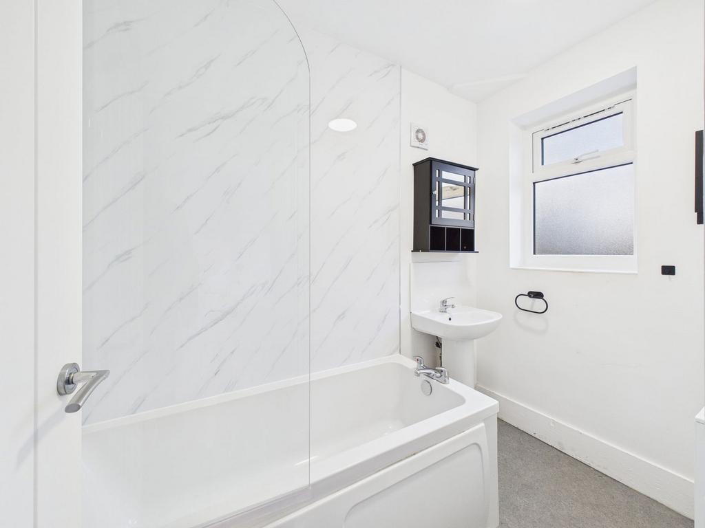 To the first floor, the property offers three well-proportioned bedrooms, all carpeted throughout. The main bedroom is a spacious double, the second bedroom benefits from built-in cupboards providing excellent storage, and the third bedroom offers a flexible space ideal for a home office, guest room or child’s bedroom. Completing the upper floor is a modern family bathroom, finished with marble-effect shower boards, a built-in bath with overhead shower and glass screen, and a pedestal sink. The WC is conveniently located in a separate room accessed from the landing.