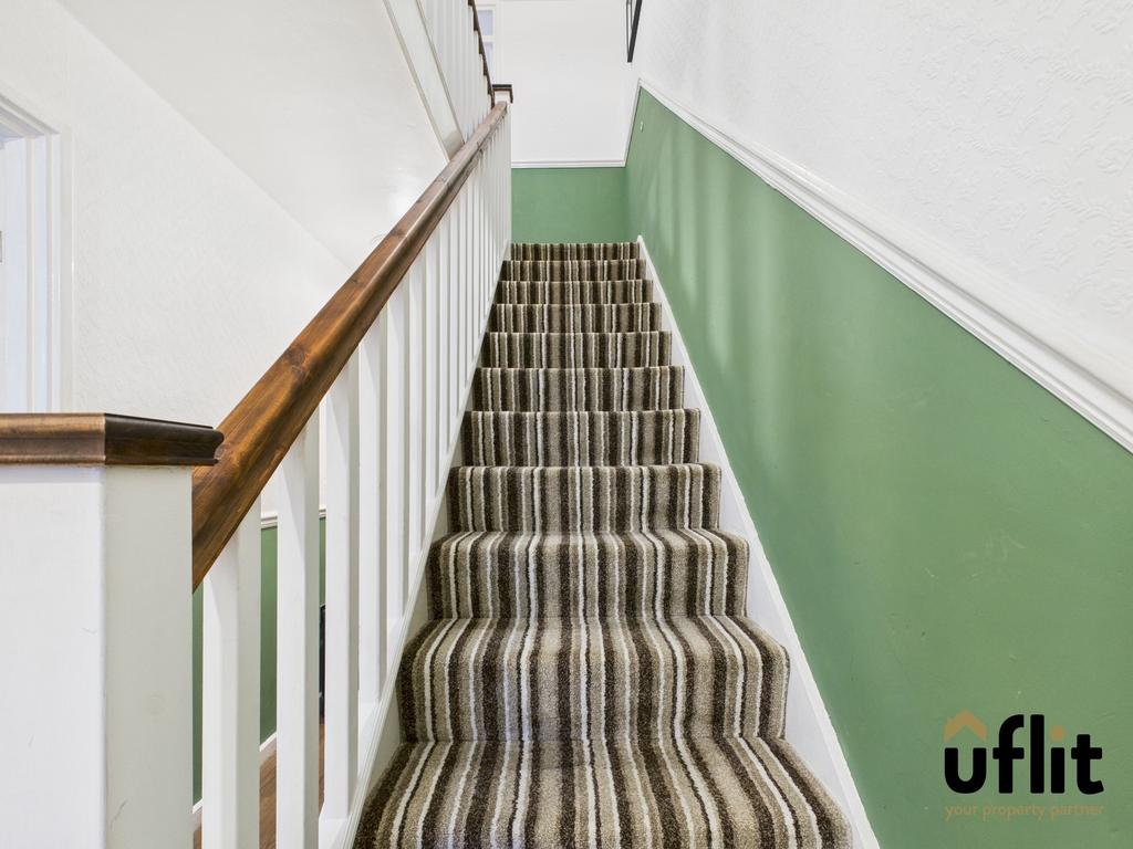 To the first floor, the carpeted landing provides access to three bedrooms, a storage cupboard and the family bathroom. The main bedroom is a generously sized double with a front facing window, while the second bedroom is another spacious double overlooking the rear garden. The third bedroom is a comfortable single room, also rear-facing, making it ideal for a child's room, home office or guest space.