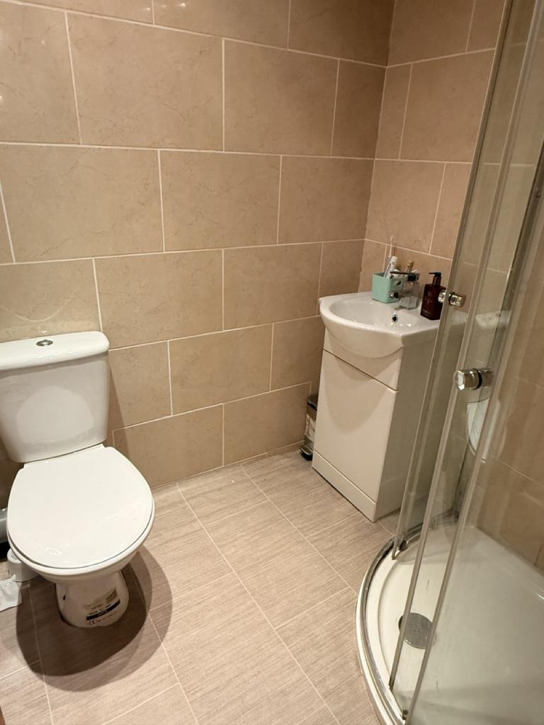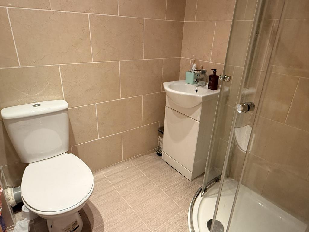 White suite with corner shower cubicle and vanity wash hand basin. Fully tiled walls. Extractor fan. Heated towel rail.