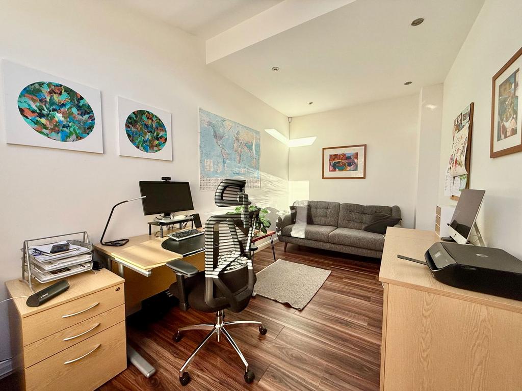 The separate lounge is of generous proportion and enjoys dual aspect windows, while double doors from the hallway reveal a superb open plan living, dining and kitchen space. The kitchen is fitted with a contemporary range of handleless units beneath quartz worktops, complemented by quality integrated appliances including Neff oven and grill, Bosch dishwasher, inset stainless steel sink, integrated fridge and freezer and a full bank of storage with open shelving. A large central island provides further workspace incorporating induction hob with built-in extractor, wine cooler and breakfast bar overhang. This sociable space flows seamlessly into a light-filled dining and sitting area, enhanced by Velux windows and impressive sliding patio doors to the side and rear, framing delightful views over the private garden and adjoining farmland. A well-proportioned home office with access to sub level store room, completes the ground floor.
