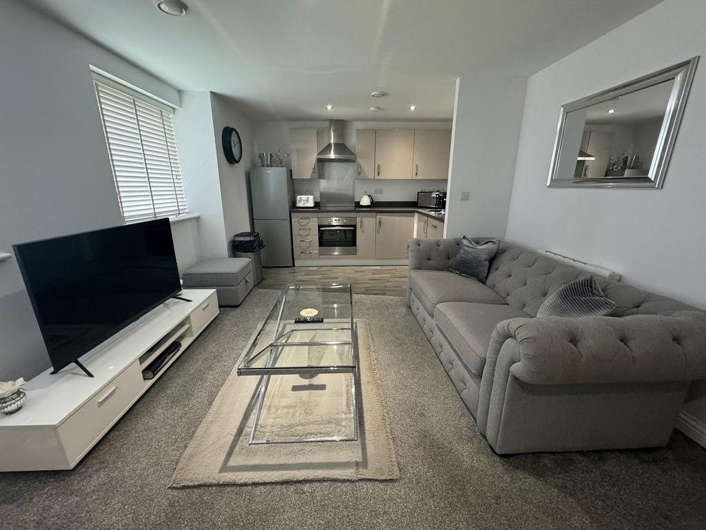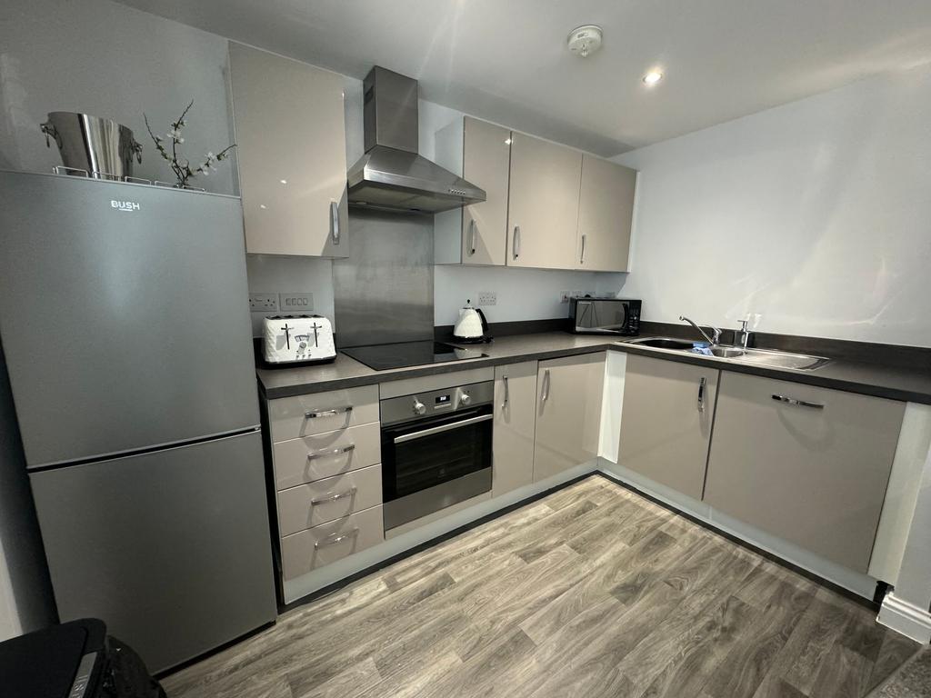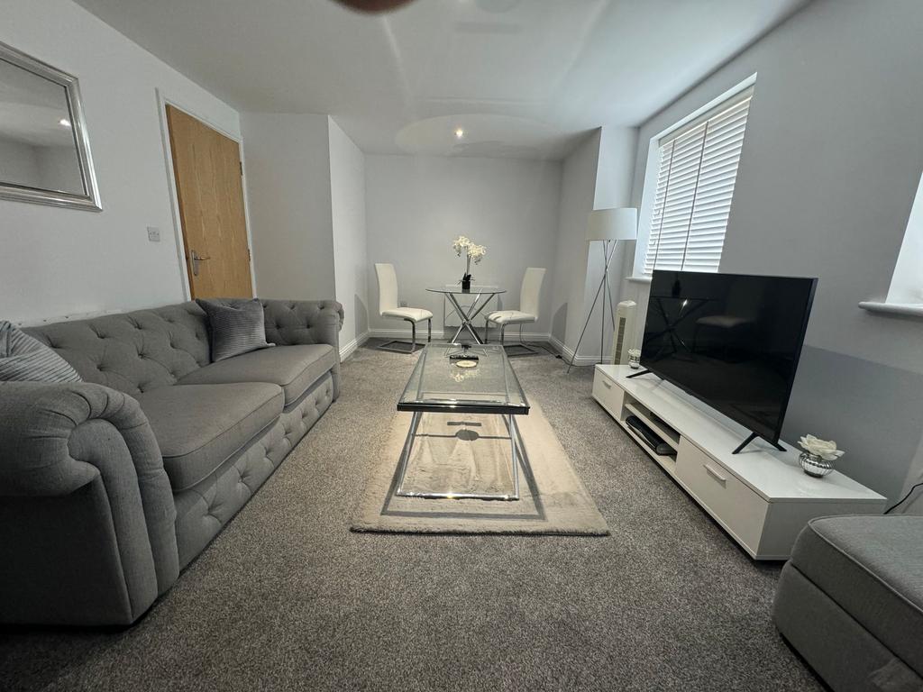 Window to front, fitted kitchen with a range of base and eye level units, built in dishwasher, built in washing machine, free standing fridge freezer, electric hob, electric oven, microwave, kettle, toaster, Lino flooring, living area, power sockets, television points, sofa, dining room table, television stand, coffee table, carpet floor.