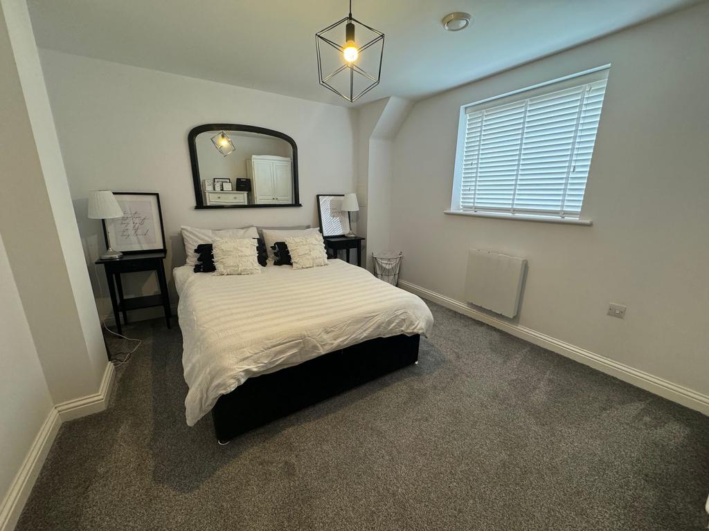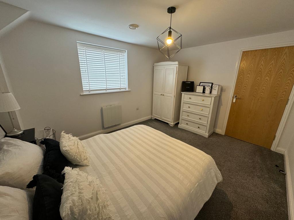 Window to rear, bedside table, double bed, chest of draws, power sockets, radiator, carpet flooring.