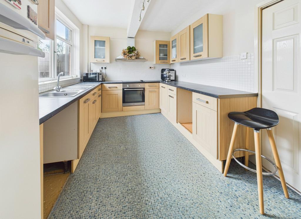 KITCHEN 14' 11" x 9' 1" (4.55m x 2.77m) With a range of wall and base units, built in oven and hob with extractor above, space for further appliances and door to:-