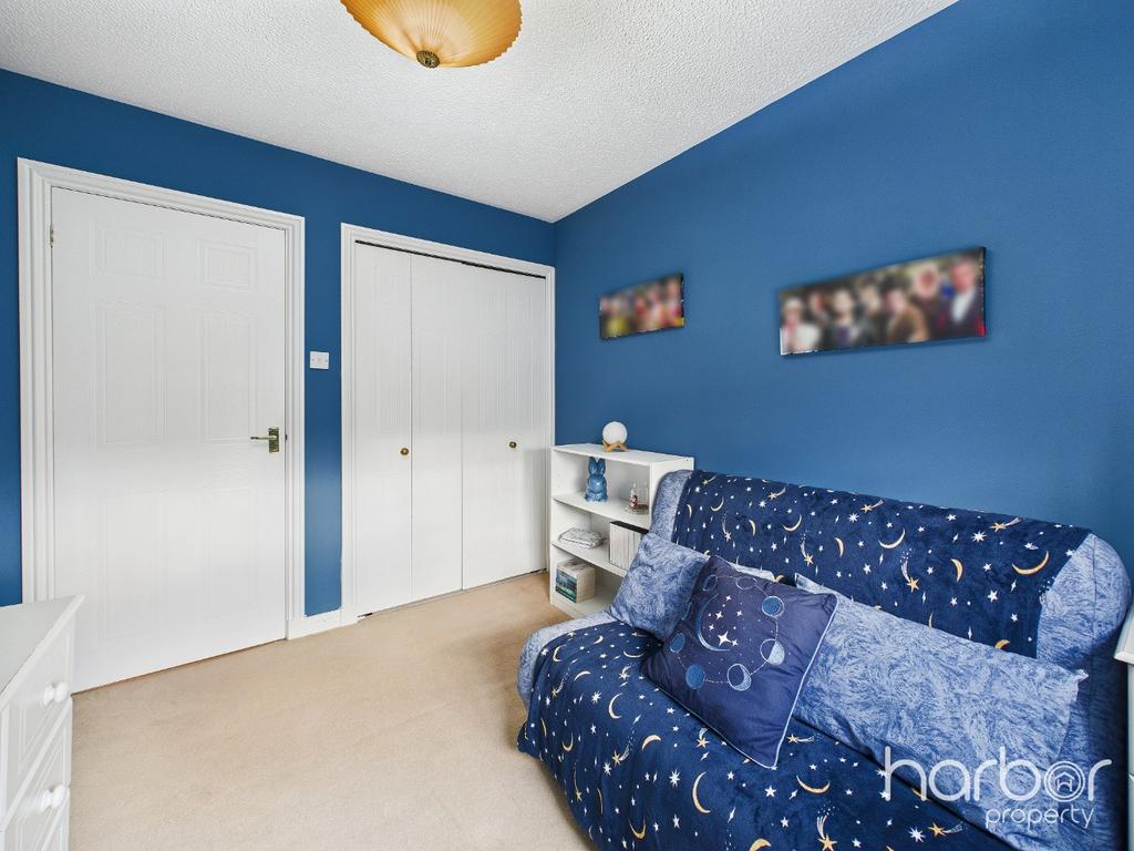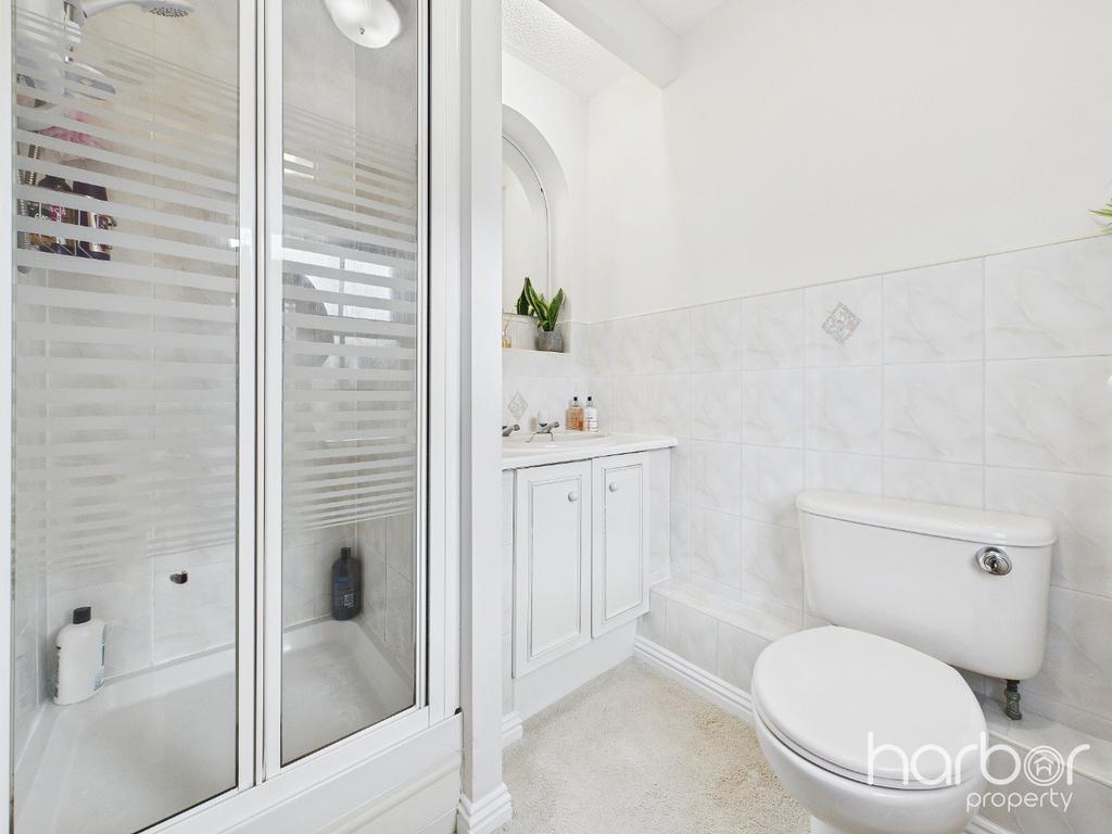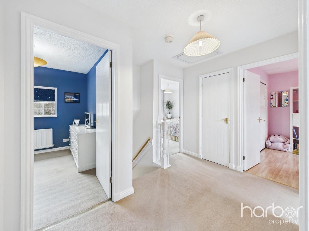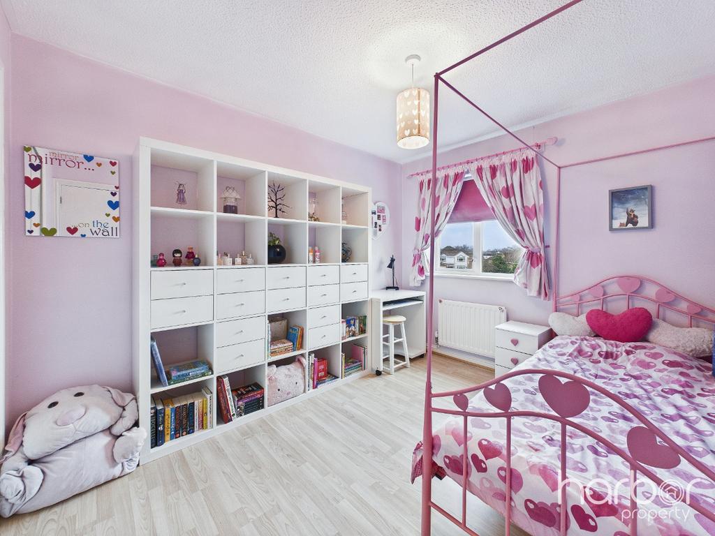 Upstairs, the home continues to impress with four well-sized bedrooms, all benefiting from fitted storage—a rare and highly desirable feature for properties of this type. The principal bedroom enjoys the added luxury of a private en-suite, complete with WC, wash hand basin and shower. The family bathroom is stylish and practical, featuring a bath with overhead rainfall shower, ample storage, WC and wash hand basin.
