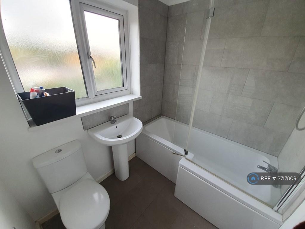Double glazed window to the rear aspect, suite comprising of P shaped bath with power shower, wash hand basin, low level WC, Towel rail