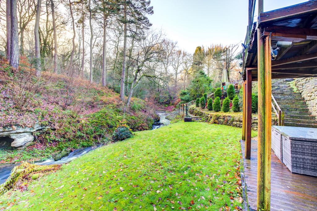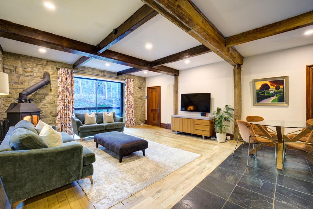 The ground-floor living room opens directly onto a raised deck overlooking the garden, woodland and stream ideal for everyday living and outdoor dining. On the lower ground floor, with direct access to the gardens and water, a relaxed family room with log-burning stove offers a more intimate connection to the river, perfect for quiet evenings or winter nights.