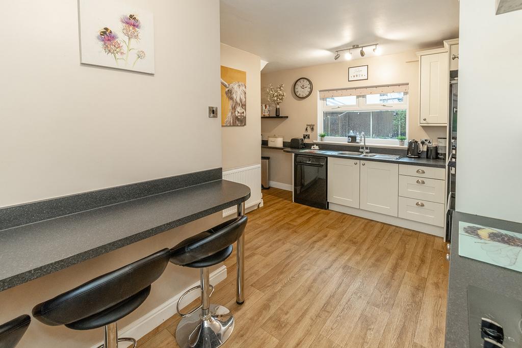Well appointed kitchen with extensive range of modern kitchen base units with complementary worksurfaces, wall units, 1 ½ bowl stainless steel sink with mixer taps, built in electric double oven and microwave, electric hob and extraction hood, upvc double glazed windows to the front and rear, radiator, door to the garage, understairs store cupboard.