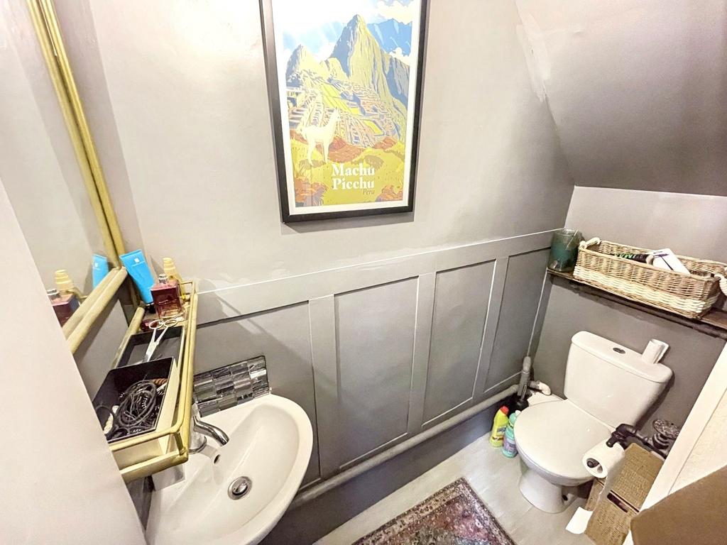 To the half landing, comprising roll top free standing bath, walk in shower cubicle and pedestal wash hand basin. Separate w.c. Double glazed window to the rear and central heating radiator.