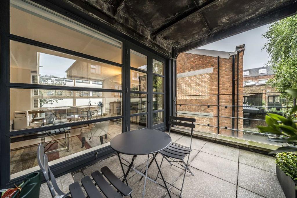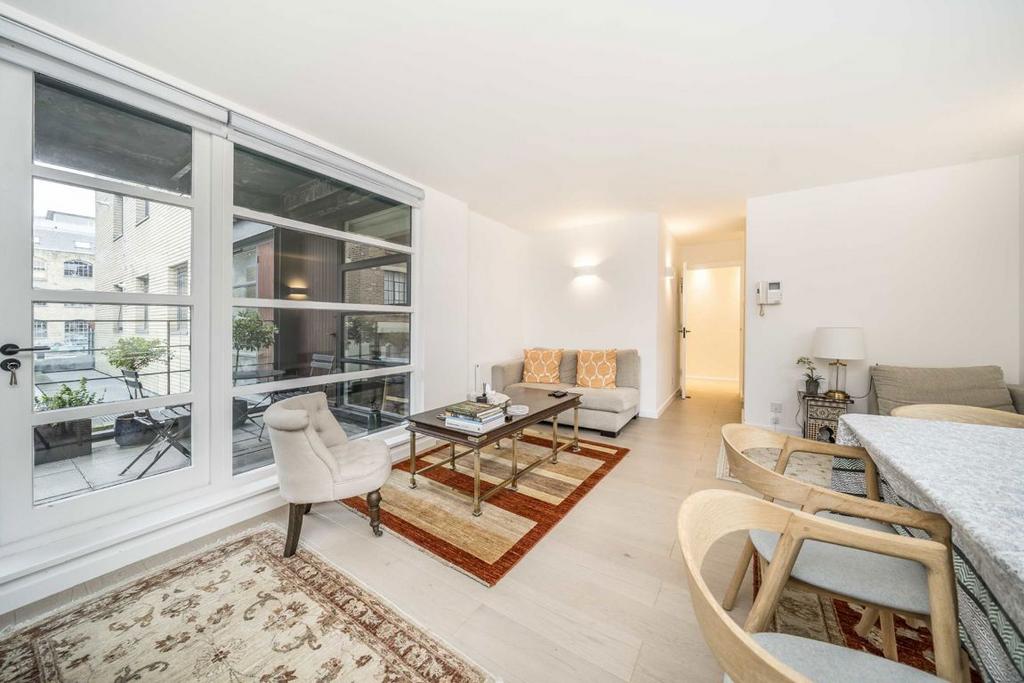 A recently refurbished two double bedroom, two bathroom apartment set within a secure gated development on New Wharf Road. The property features a spacious living area with large windows, a separate fitted kitchen, and a private balcony. The principal bedroom includes a dressing area and en-suite bathroom.