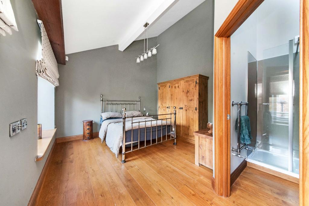Bedroom two is a pleasant double bedroom with ample space for free standing furniture. It benefits from two banks of Alu-Clad windows to the side elevation which have a pleasant view out to the front courtyard. There is a part vaulted ceiling with an exposed timber beam on display, oak flooring with underfloor heating, central ceiling light point and a door provides access to the en-suite shower room.