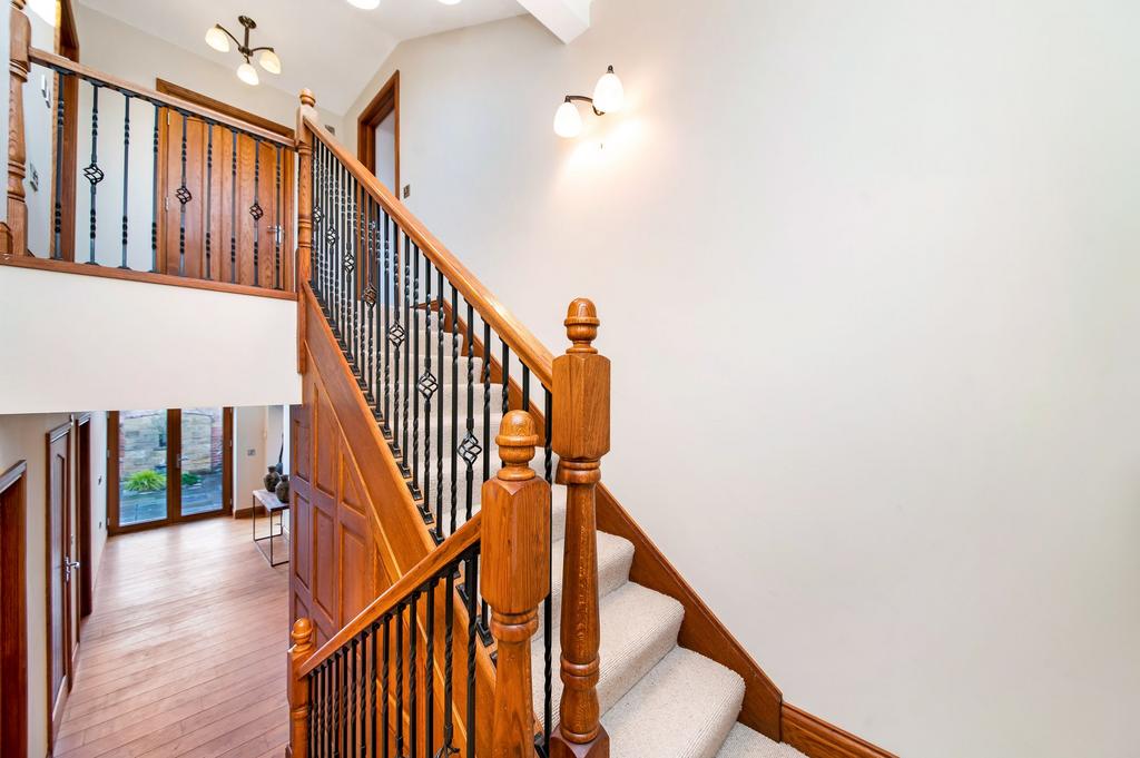 Taking the staircase from the entrance hall, you reach the mid-level and first floor landing which features a double-glazed sky light window with integrated blind and remote function to the rear elevation. Mid-level on the staircase rising to the first floor there is a window opening which provides borrowed light to and from the garden/sunroom to the first-floor landing. There are two ceiling light points, two wall light points, a beautiful oak banister with twist spindle cast iron balustrade over the stairwell head and solid oak doors provide access to bedroom three, the first floor W.C. and the family room.