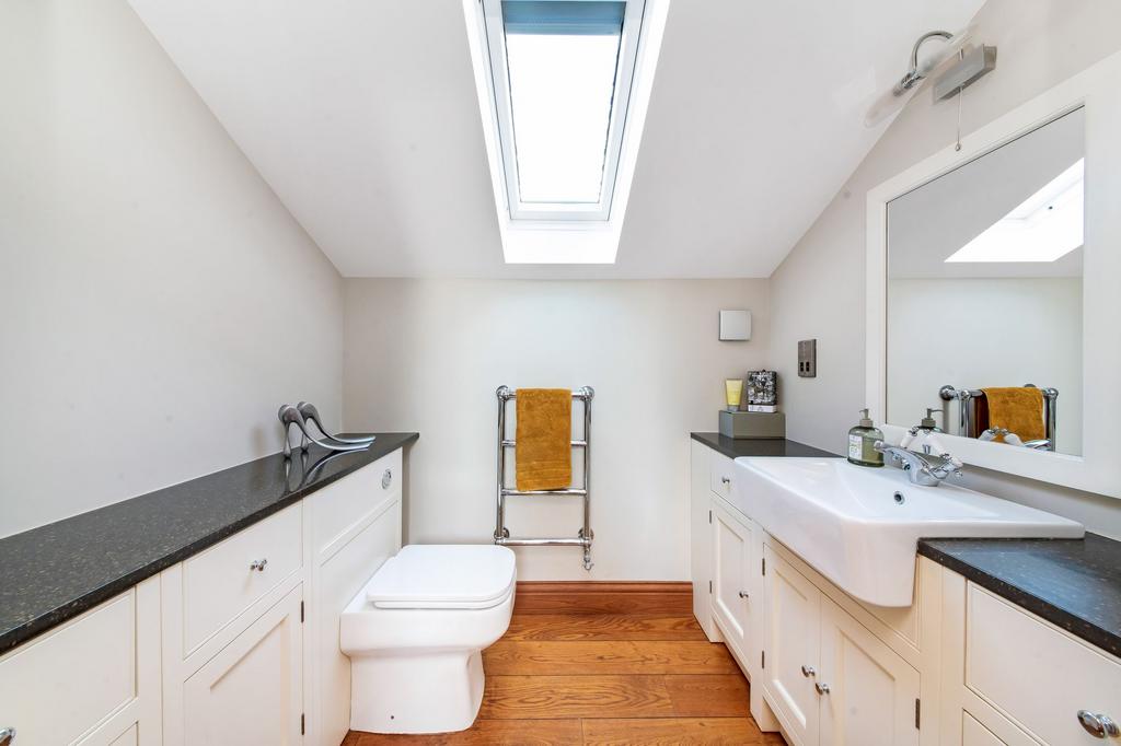 The first floor W.C. features a modern contemporary two-piece suite which comprises of a low-level W.C. with concealed cistern and push button flush which incorporates useful storage units and a broad wash hand basin with vanity cupboards beneath. There is oak flooring with under floor heating, chrome ladder style radiator, shaver point, light, and extractor fan. Additionally, there are two wall light points and a double-glazed sky light window to the front elevation.