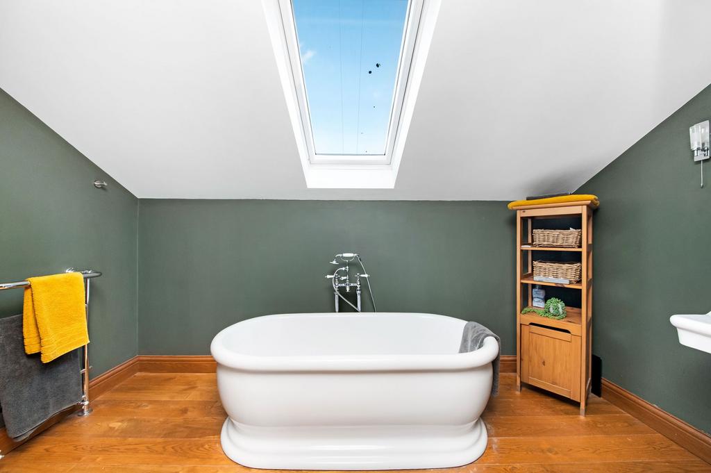 The en-suite bathroom features a fabulous high quality four-piece suite which comprises of a low-level W.C., broad pedestal wash hand basin, free standing double ended bath with floor mounted shower head mixer tap and a step in fixed frame shower cubicle with thermostatic rainfall shower. There is oak flooring, inset spotlighting to the ceiling, two light points, shaver point and an extractor fan. Additionally, there is a double-glazed remote-controlled sky light window with integrated blind to the front elevation and oak flooring with underfloor heating.