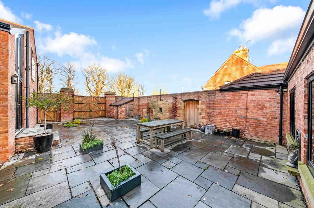 As the driveway bears left you reach a beautiful set of timber gates with fabulous brick and stone topped pillars with a separate pedestrian access gate leading onto the front courtyard. The front courtyard is particularly private and completely flagged which offers an ideal space for alfresco dining, barbequing, and sheltered entertainment. There are various external lights, beautiful antique brick and stone wall boundaries. Here is the main access into the property via the twin aluminium double-glazed doors. From the courtyard there is also the pedestrian access door into the inner hallway and there is, again, a fabulous external tap and a brick construction outbuilding/shed.